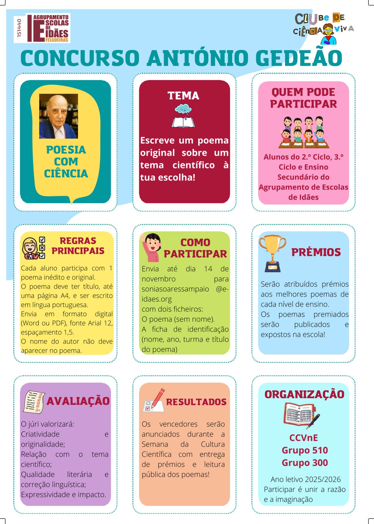 O Agrupamento de Escolas de Idães, através do seu Clube Ciência Viva na Escola (CCVnE), promove, ao longo do presente ano letivo, o Concurso de Poesia “António Gedeão”, uma iniciativa que visa incentivar a criatividade literária dos alunos e aproximar a Ciência e a Arte, à semelhança do espírito do poeta e professor António Gedeão.