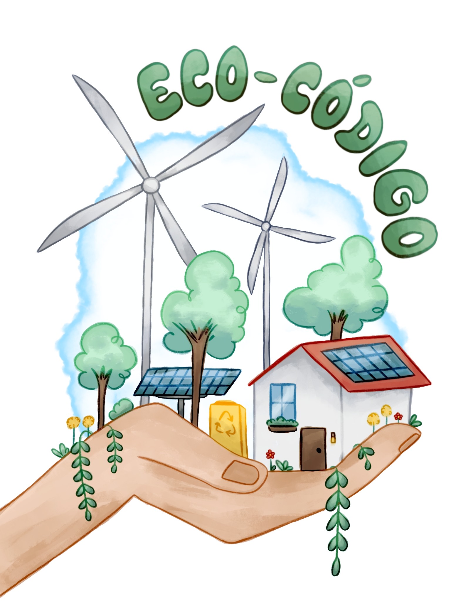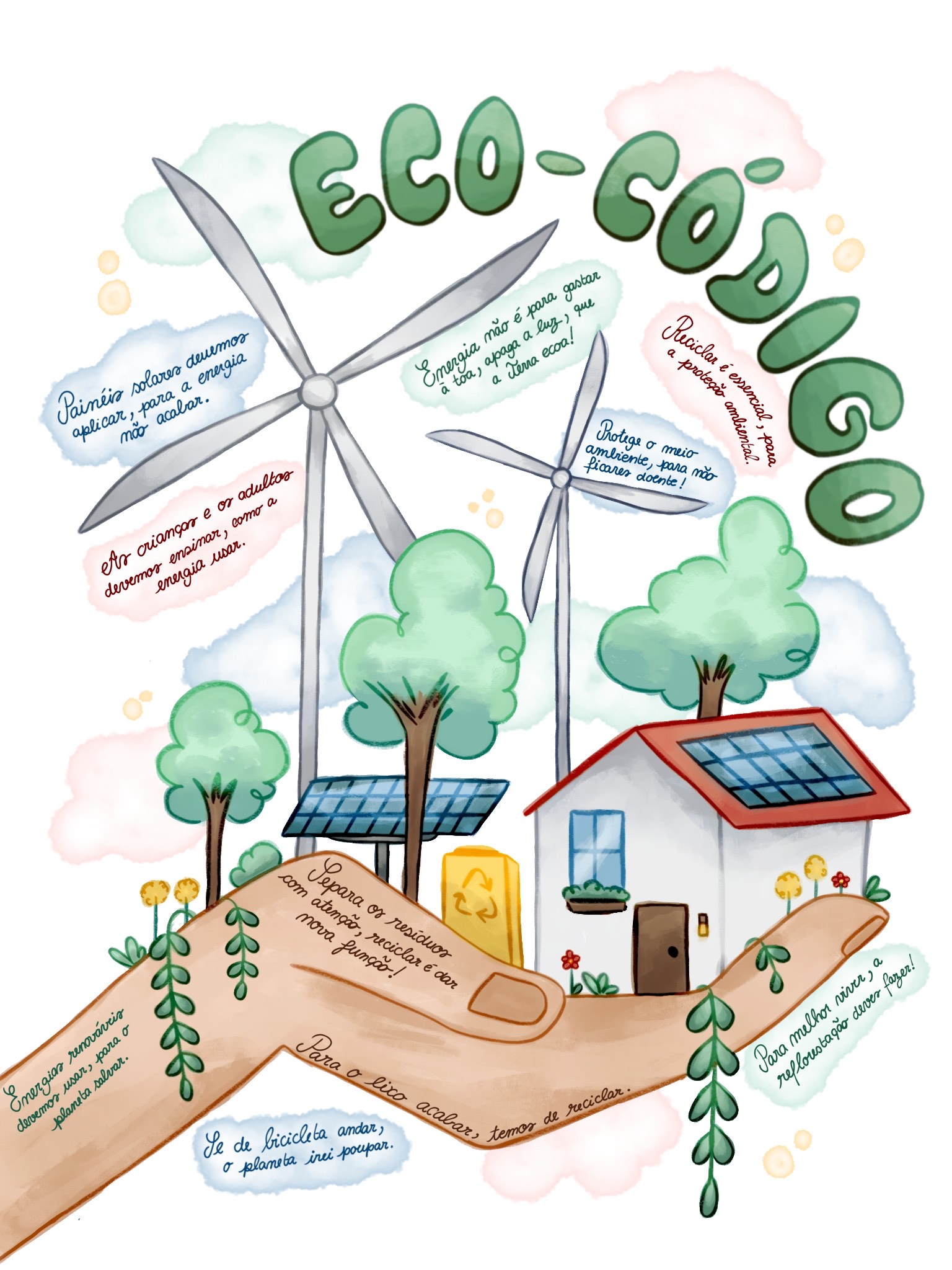 As frases inspiradoras que compõem o eco código foram criadas pelas turmas do 5.º ano, refletindo suas ideias sobre como cuidar do planeta e promover um futuro mais verde. O desenho e todo o trabalho gráfico do póster ficaram a cargo dos alunos do 12.º ano, que deram vida às palavras com ilustrações criativas e simbólicas. Este trabalho em conjunto entre as diferentes faixas etárias da escola fortaleceu o espírito de cooperação e cidadania.