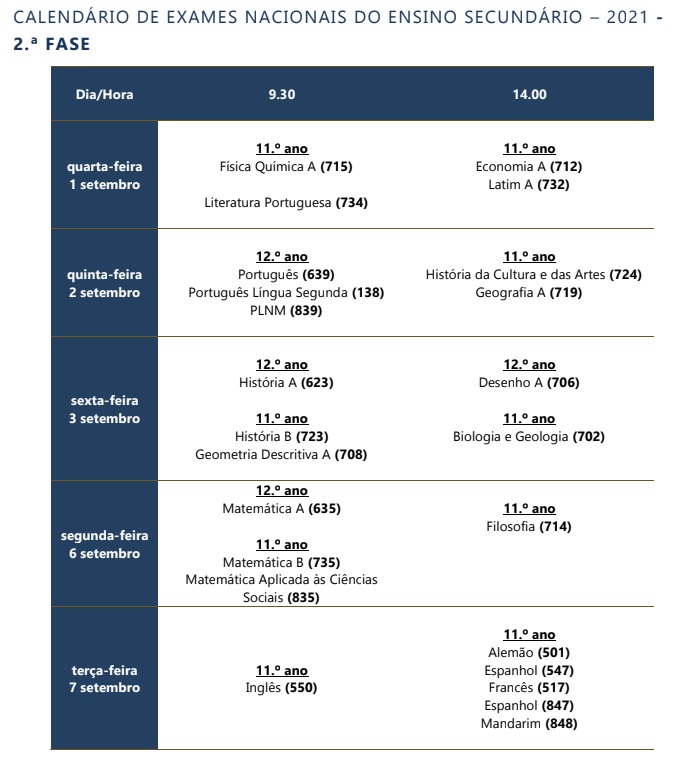 - Calendário de Exames Nacionais 2.ª fase